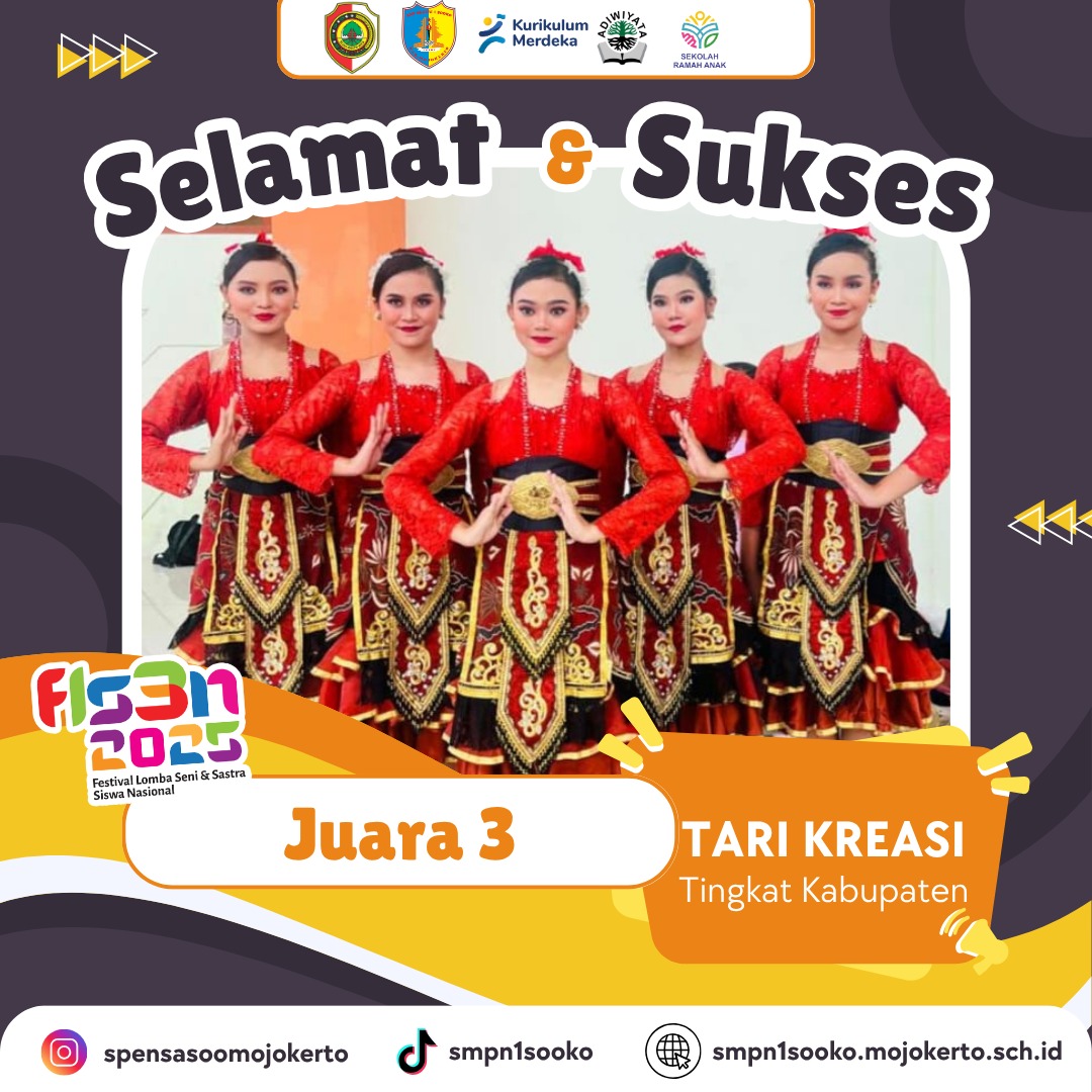 ![]() | FLS3N 2025 KABUPATEN MOJOKERTO Juara 3 Lomba Karya Cipta Kreasi Tari Tingkat kabupaten Mojokerto |